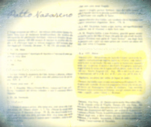Un azzurro doc come Giovanni Toti, consigliere politico di sua altezza, assicura che il patto del Nazareno esiste e che è tutto scritto nero su bianco. Lui lo ha visto. E cosa c’è scritto? Nulla, appunti. Chi lo ha firmato? Boh! Il patto è così segreto che è stato crittografato. Tra le pieghe si intravedono però alcune parole: Mediaset, procura Milano, grazia... E poi: Senato seguito dalla frase chi se ne frega!